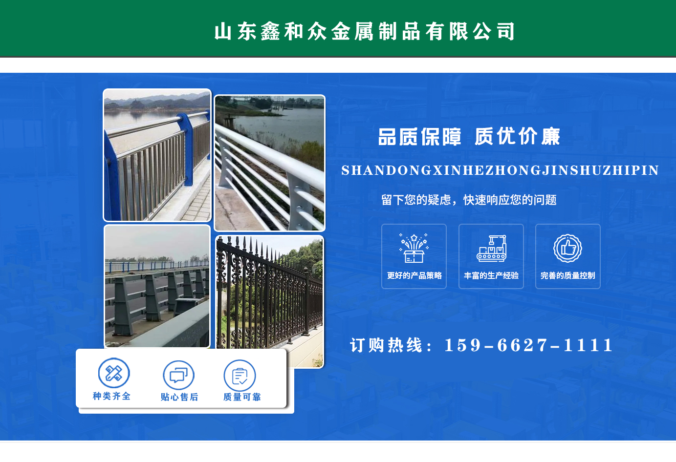 山東鑫和眾金屬制品有限公司主要產(chǎn)品有防撞護欄,橋梁護欄,道路護欄,河道護欄,不銹鋼護欄等護欄。提供設計方案,一站式定制,包您滿意價格優(yōu)惠,歡迎來電咨詢!    公司常年從事銷售護欄防撞護欄,橋梁護欄,道路護欄,河道護欄,不銹鋼護欄,橋梁鋼護欄,河道燈光護欄等。產(chǎn)品廣泛應用于橋梁、河道、旅游景區(qū)、道路、公路、公園、小區(qū)、景觀、道路防撞等領(lǐng)域。    公司產(chǎn)品均采用優(yōu)質(zhì)不銹鋼材料,符合相關(guān)標準。各種型號不銹鋼復合管及護欄,質(zhì)量嚴格把控。產(chǎn)品強度高、耐腐蝕、焊接牢固、抗沖擊、性能好,防撞護欄結(jié)構(gòu)簡單、美觀實用大方。     歡迎前來訂購!...